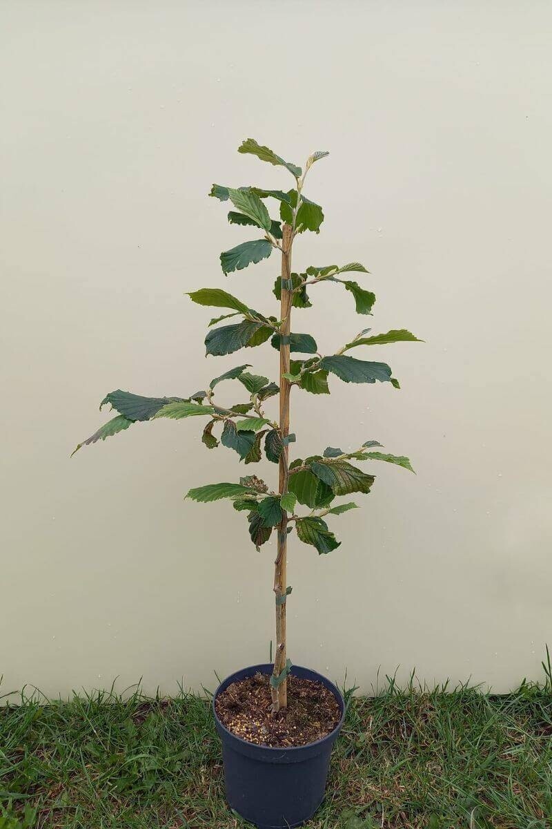 Der Stamm und die Äste dieses jungen Zaubernussbaums sind braungrau, was einen schönen Kontrast zum grünen Laub bildet.