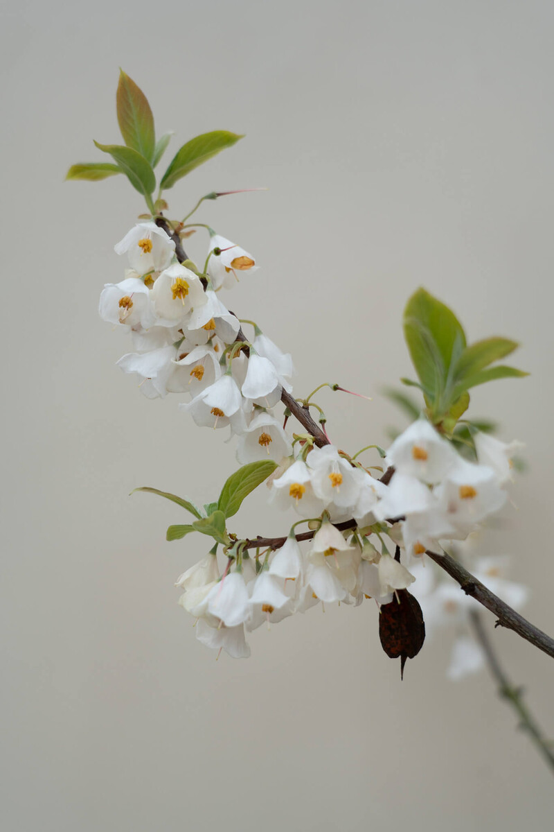 Der Schneeglöckchenbaum blüht von April bis Mai reichlich mit einer Fülle von weißen, hängenden Glöckchen an den noch kahlen Zweigen. Daher verdankt die Art auch den Namen Schneeglöckchenbaum.