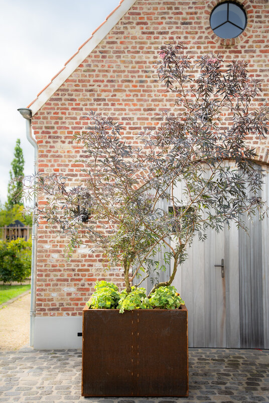 Whether you opt for an olive tree, ornamental pear tree, or multi-stem birch, this planter is the perfect base for your tree in a Corten steel planter. The right substrate, sufficient rooting space, good drainage, water reservoir*, and professional planting ensure that the tree is immediately well established and can continue to develop.