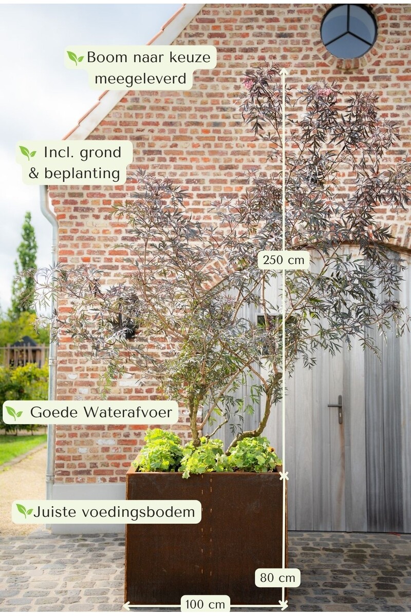 This Corten steel planter with tree instantly creates atmosphere and character. The warm rust-brown steel combined with a beautiful tree makes it an eye-catching feature in any outdoor space.