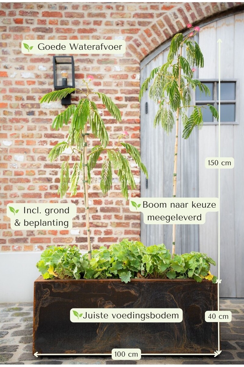 Whether you opt for an olive tree, ornamental pear tree, or multi-stem birch, this planter is the perfect base for your tree in a Corten steel planter. The right substrate, sufficient rooting space, good drainage, water reservoir*, and professional planting ensure that the tree is immediately well established and can continue to develop.