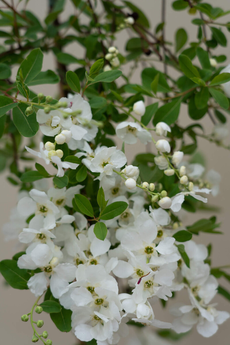 The Exochorda macrantha 'The Bride' has an upright and compact growth habit with drooping branches.