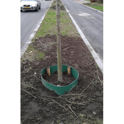 Graaf de gietrand rondom de kluit van de boom voor ongeveer 10cm diep in de grond en zorg ervoor dat deze netjes rond staat en goed aansluit om de wortelkluit van de boom.